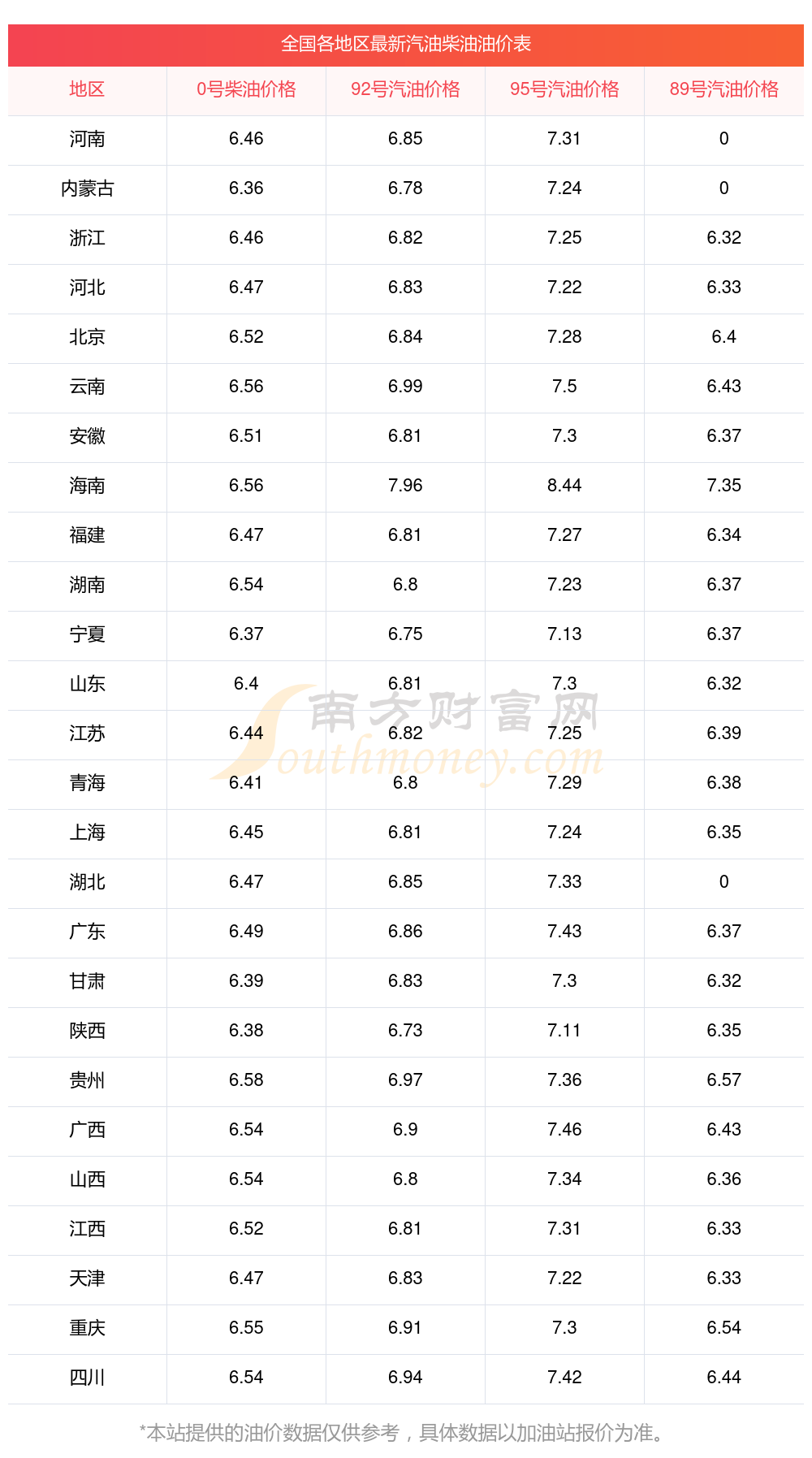 油价数据仅供参考,请以您所在地区的加油站报价为准。南方财富网发布此信息的目的是传播更多详细的信息,对使用该油价信息所导致的结果概不承担任何责任。